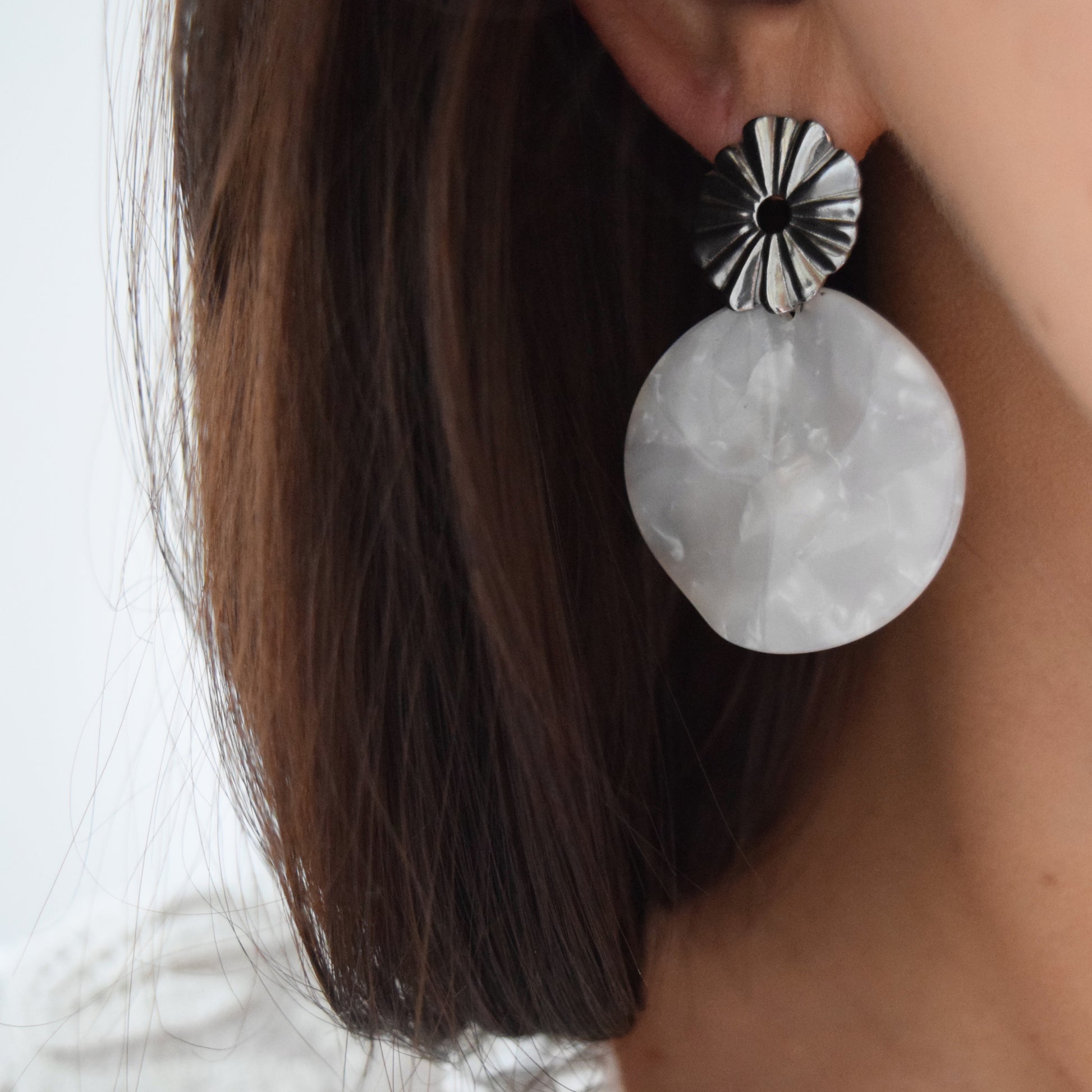 Boucles d’oreilles avec puce d'oreilles diamètre 18 mm en acier inoxydable et pendentif ondulé en résine couleur nacrée diamètre 34mm.