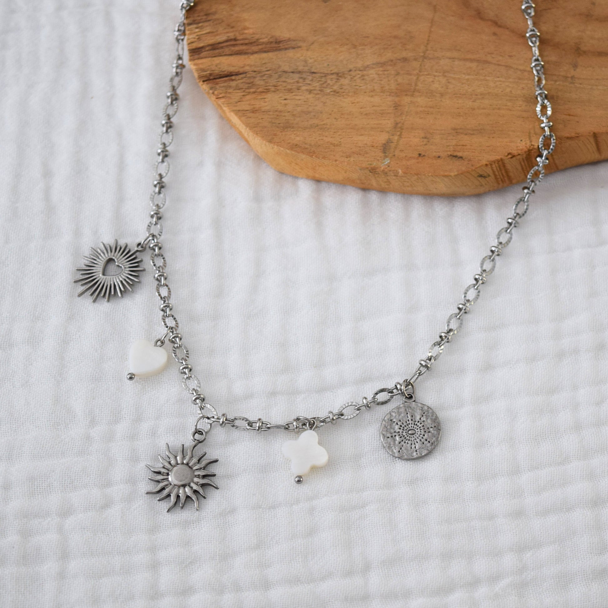Collier composé d'une chaîne en acier inoxydable avec 5 charms en acier et nacre
