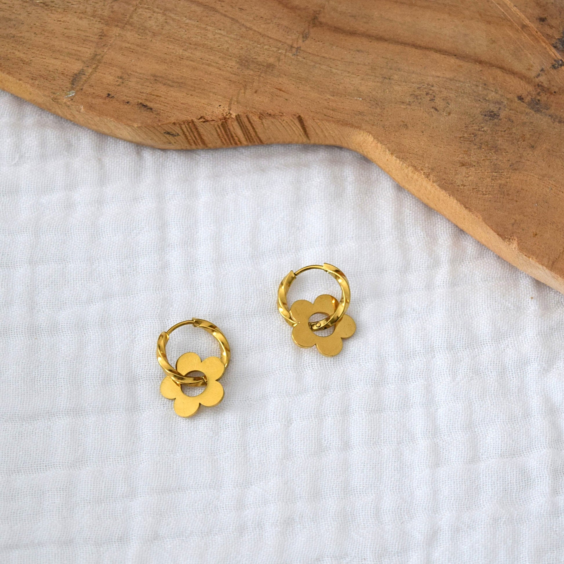 Sur une base de créoles en acier inoxydable doré, composez vos boucles d’oreilles à l’infini. Fleurs, perles, cœurs… mixez, assemblez, collectionnez selon vos envies !